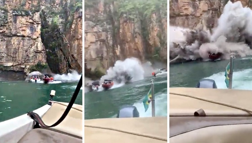 Rescue teams including a dive squad and members of the Brazilian Navy rushed to Furnas Lake in Minas Gerais state, where panicked tourists had watched helplessly as a large rock fragment broke off a ravine and plunged atop three boats.
