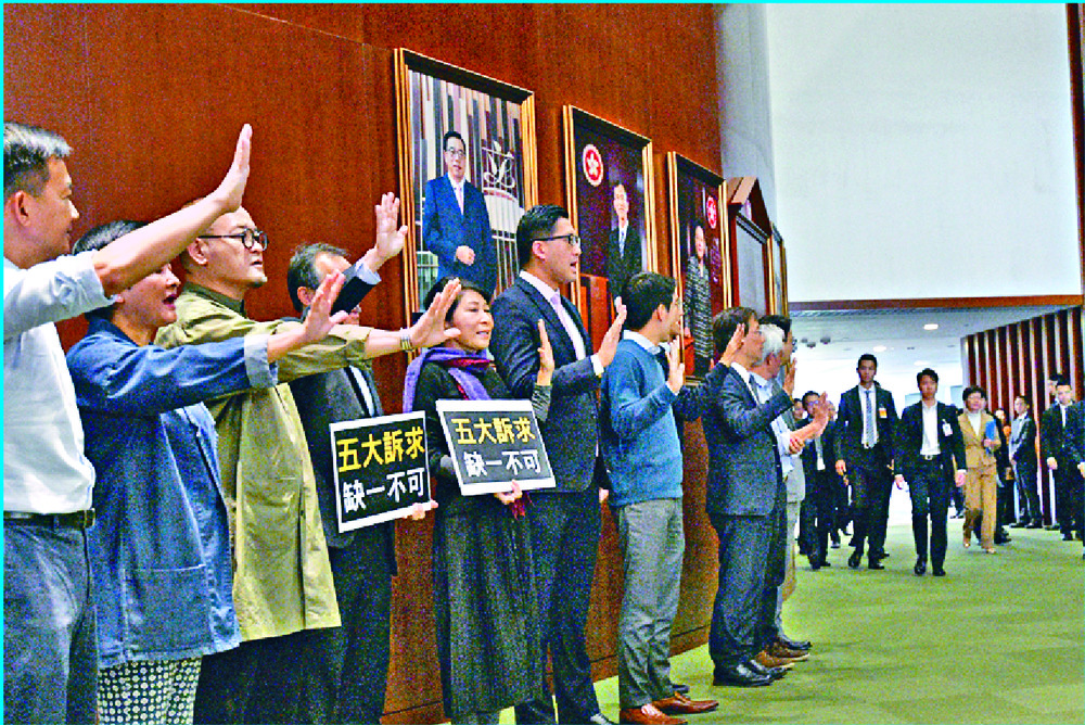 Twelve pan-democrats and one pro-Beijing unionist were ejected from the Legislative Council chamber in a ruckus during the question and answer session yesterday.