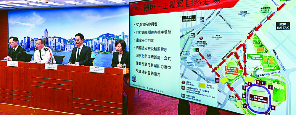 About 50,000 participants will enter the Kai Tak Stadium at 6pm for a 90-minute music performance by disciplined forces scheduled to start at 8pm, during which different incident scenarios will play out. It is understood that the Correctional Services Department will be responsible for the entertainment, but other disciplined departments will also perform.Concurrently, around 13,000 people will enter the Youth Sports Ground and Kai Tak Arena to assess normal dispersal and emergency evacuation procedures.