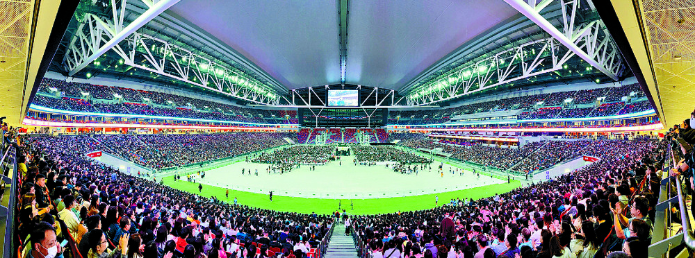 All seats will be filled when the stadium unlocks its roof tomorrow. Below: a drill on January 24. SING TAO