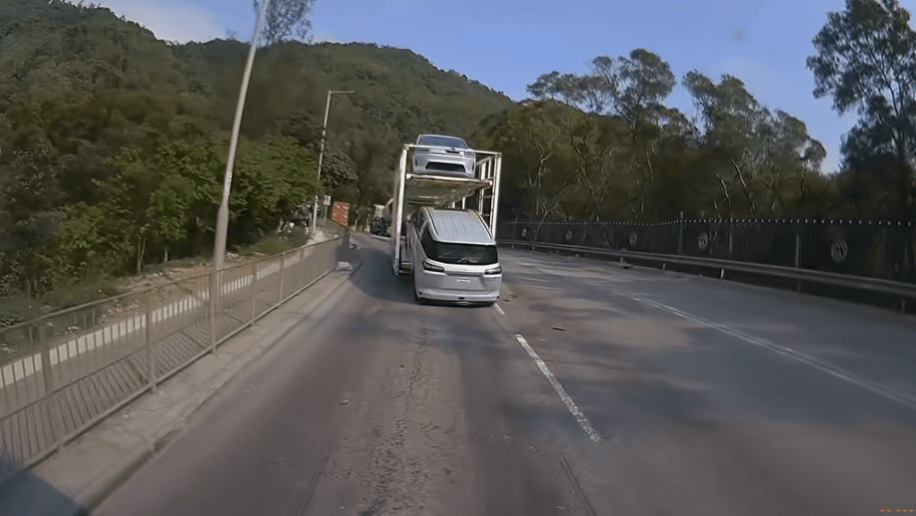 The incident occurred around 4pm on Sai Tso Wan Road near a KMB bus depot. Dashcam footage shows the transporter slowing down and then accelerating when the car on the lower deck began to roll backward off the platform, wobbling before stopping on the road. A following vehicle managed to brake in time to avoid a collision.