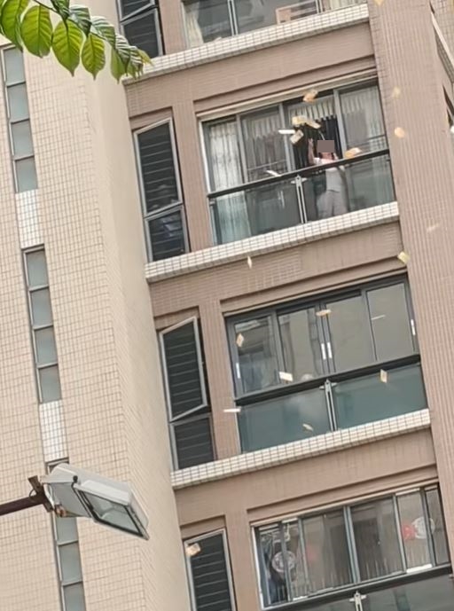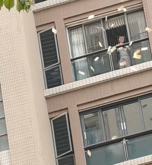 An unusual event unfolded in the Longhu District of Shantou this morning when a woman was seen tossing handfuls of HK$1,000 banknotes from the balcony of her high-rise apartment at the Star Lake City residential complex.