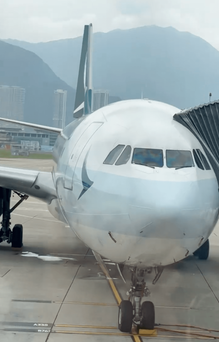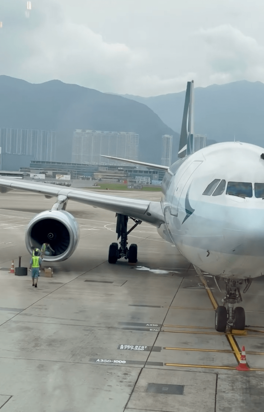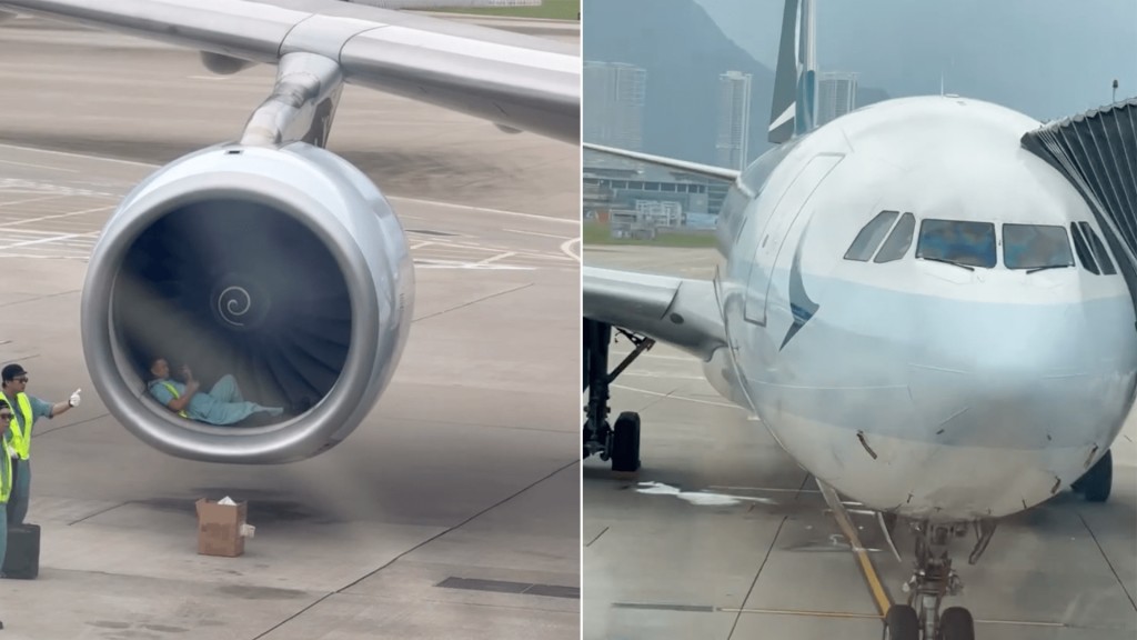 The image showed several ground crew working near the wing and engine of a parked Cathay Pacific A330-300 aircraft at Hong Kong International Airport. One person was lying in front of the engine intake, while two others stood on the outer side. A cardboard box was also visible on the ground.