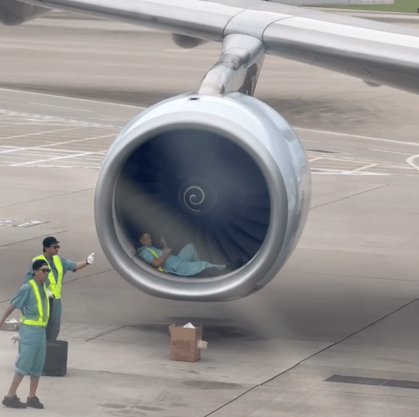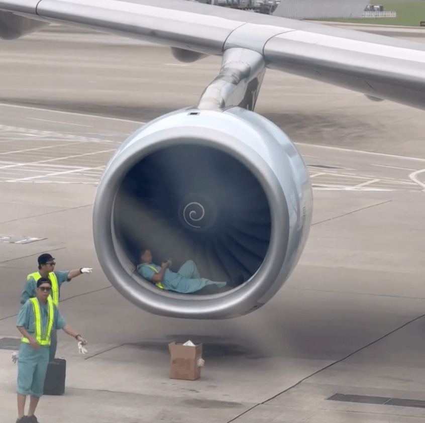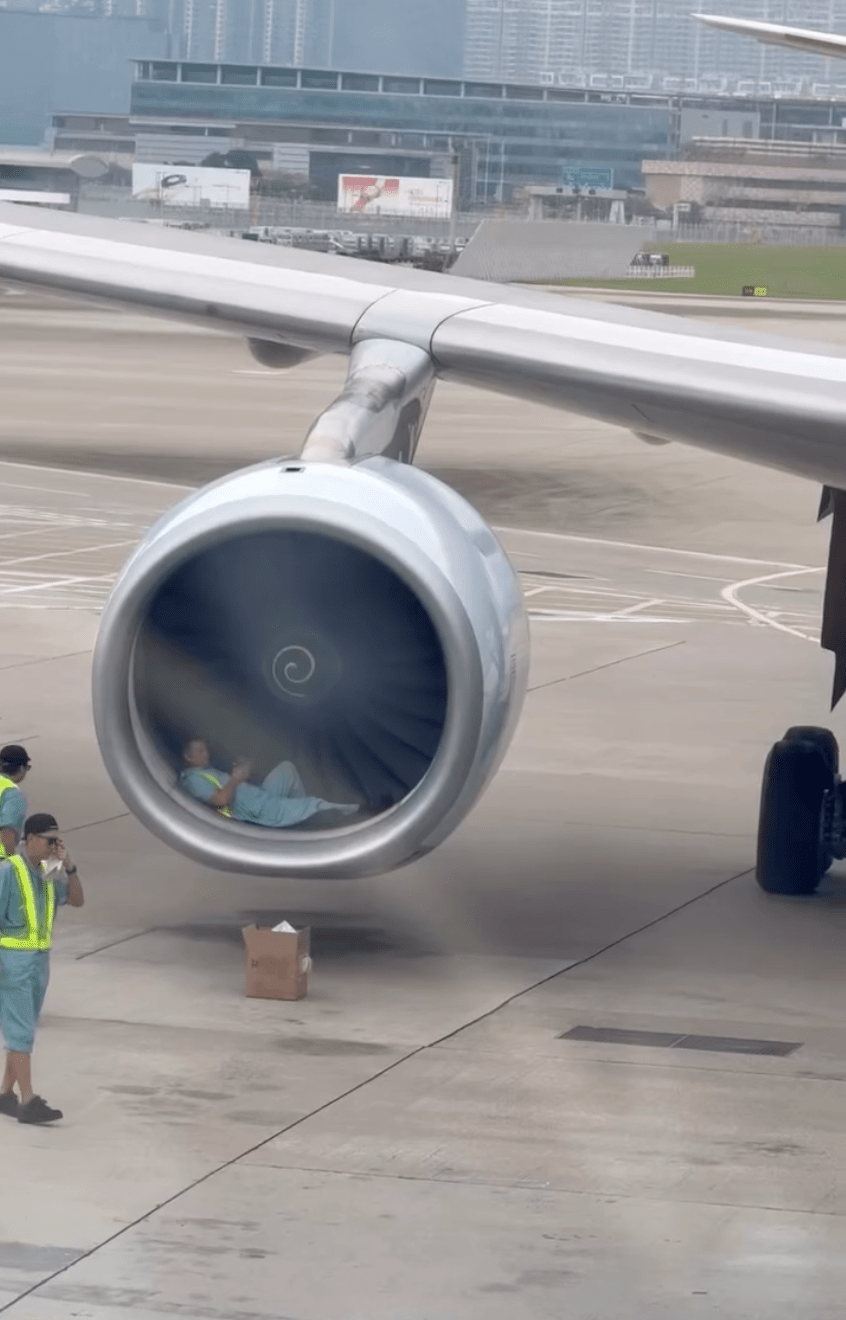 A photo circulating on social media platform Threads on Monday showed a ground crew member lying in front of an aircraft engine, prompting online speculation about safety breaches, with the Airport Authority confirming the person was conducting maintenance work.
