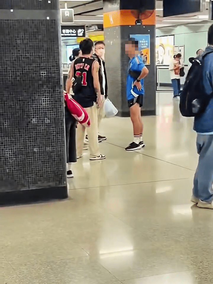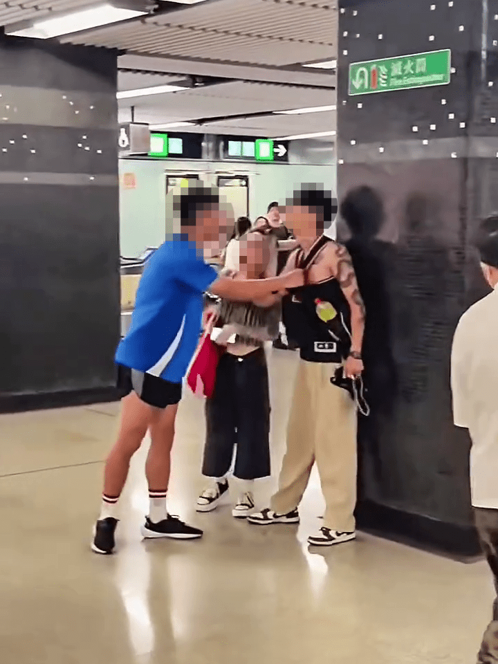 A man in a blue shirt pushed a couple to the ground during a dispute at Diamond Hill MTR station on Sunday lunchtime, prompting a bystander to intervene and a heated confrontation with the woman's tattooed boyfriend, online footage shows.