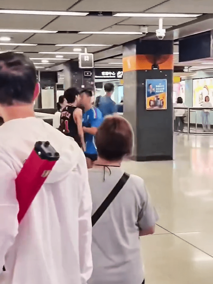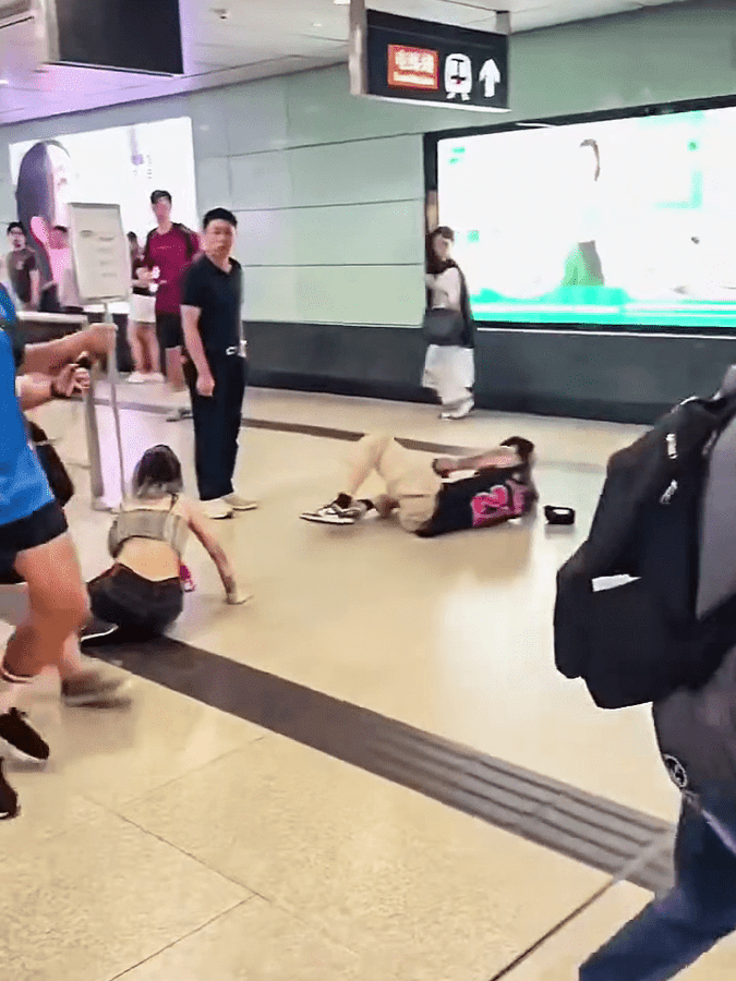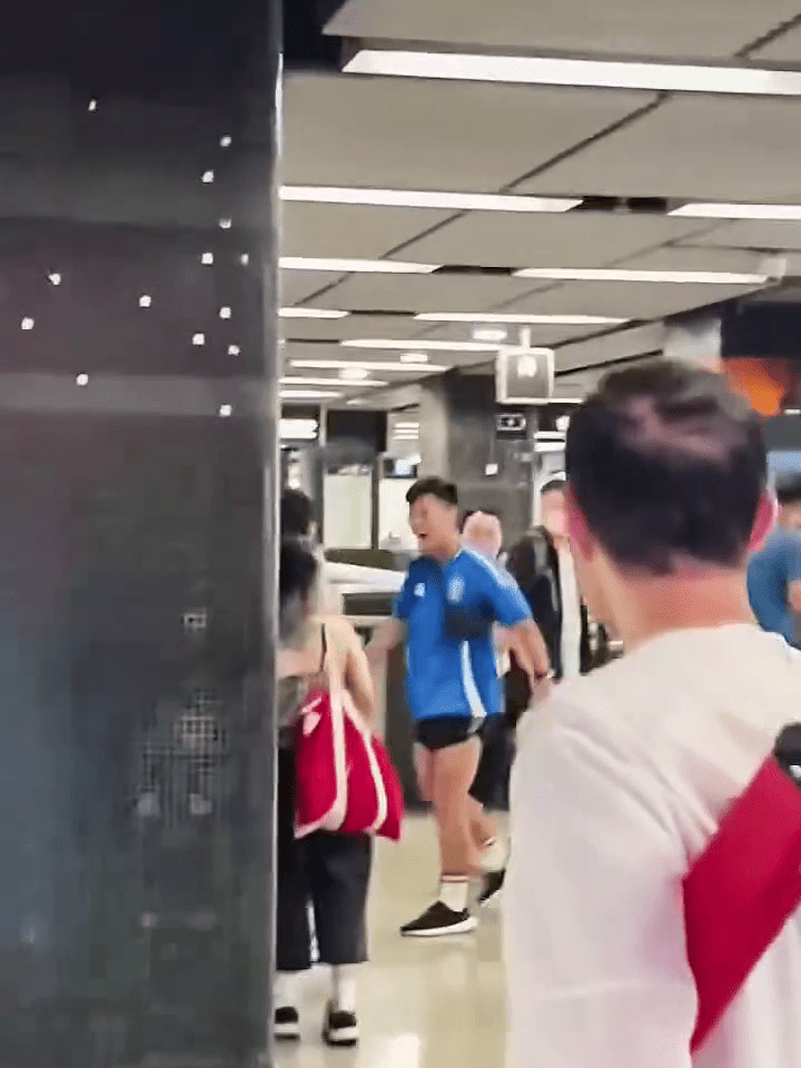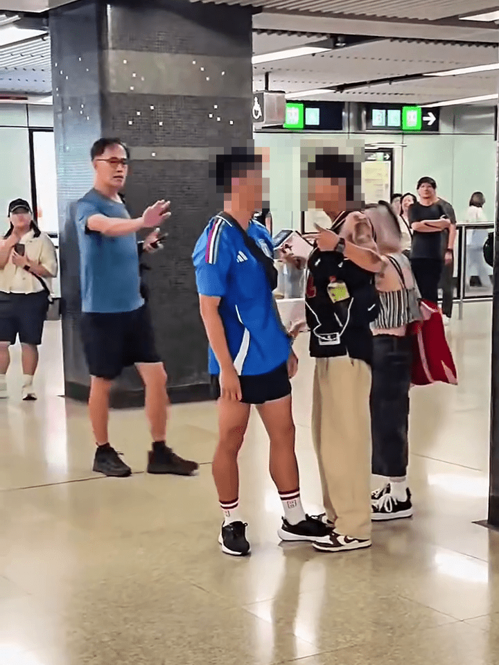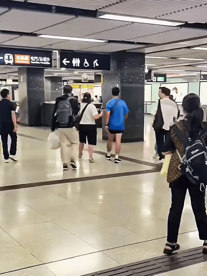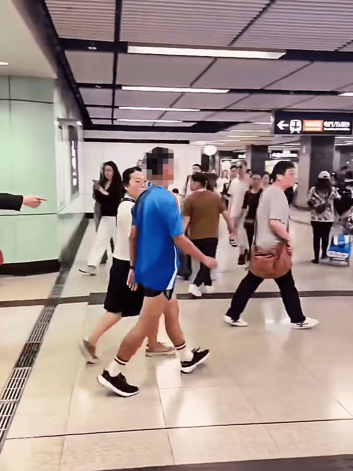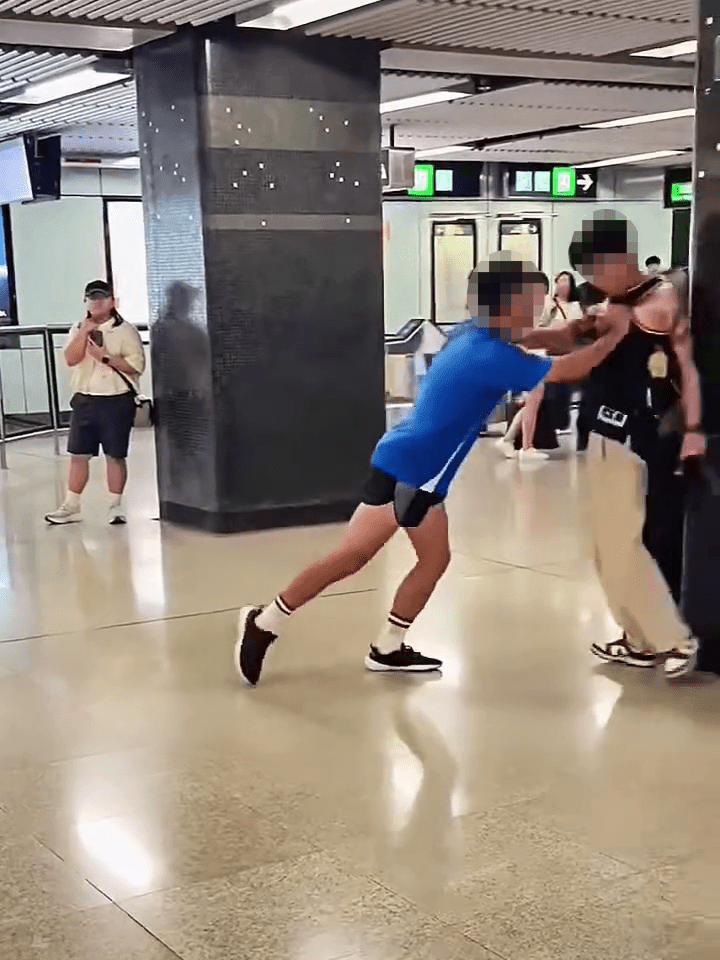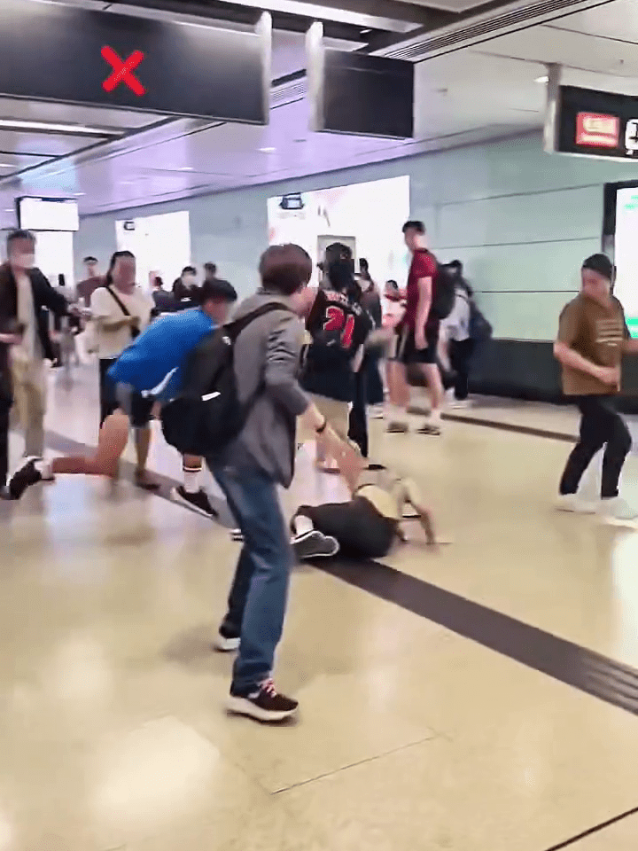 The incident occurred around noon at the station concourse between the Tuen Ma Line and Kwun Tong Line. After the blue-shirted man pushed both the man and the woman to the ground, he attempted to leave. A bystander followed him, saying: "You're wrong to hit people. I've called the police."