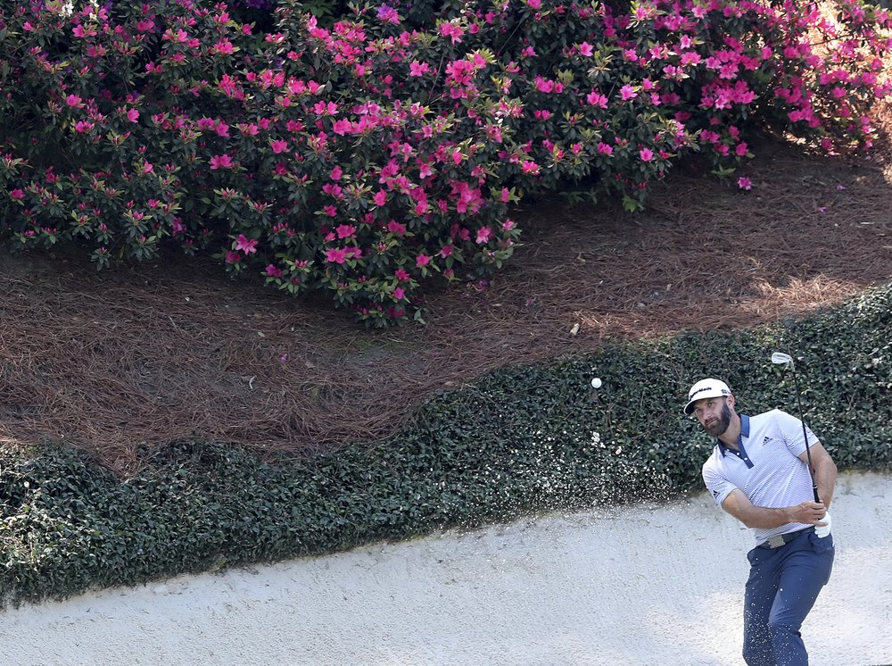 The azaleas are beginning to pop as Dustin Johnson hits his bunker shot to the 12th green during his practice round for the Masters at Augusta National Golf Club on Tuesday, April 6, 2021, in Augusta, Georgia.