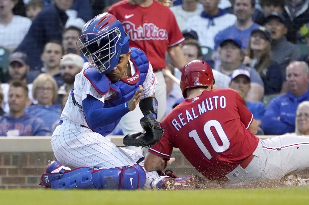 Philadelphia Phillies' J.T. Realmuto scores past Chicago Cubs catcher Robinson Chirinos during the second inning of a baseball game Thursday, July 8, 2021, in Chicago.