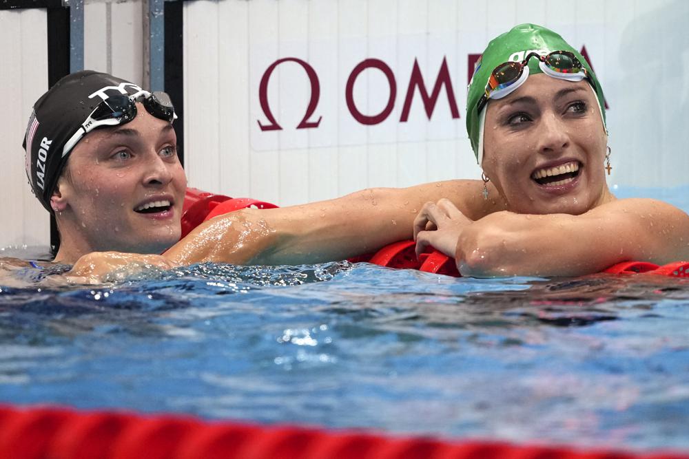 Tatjana Schoenmaker, right, of South Africa, celebrates after her women's 200-meter breaststroke semifinal with Annie Lazor, of the United States, at the 2020 Summer Olympics, Thursday, July 29, 2021, in Tokyo, Japan.