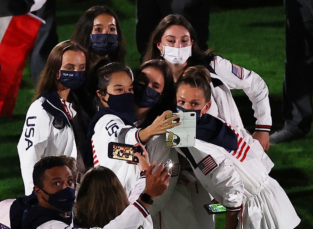 Athletes from the United States take a selfie during the closing ceremony. (Reuters)