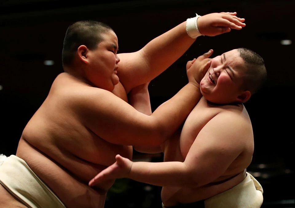 A typical scene in Japan's traditional wrestling - except the loin-clothed wrestlers were 11 years old, each weighing more than many grown men.