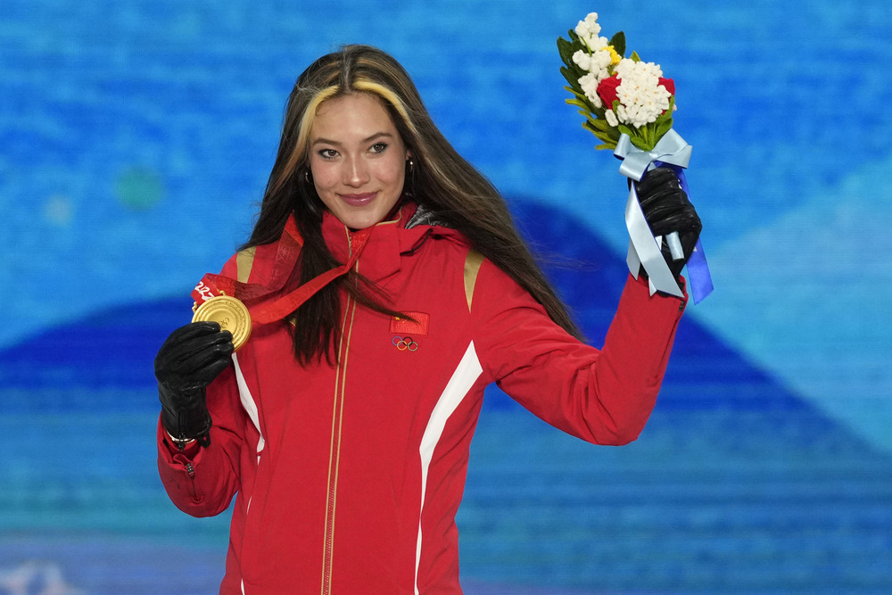 Gold medalist China's Eileen Gu celebrates during a medal ceremony for the women's freestyle skiing halfpipe competition at the 2022 Winter Olympics. (AP)