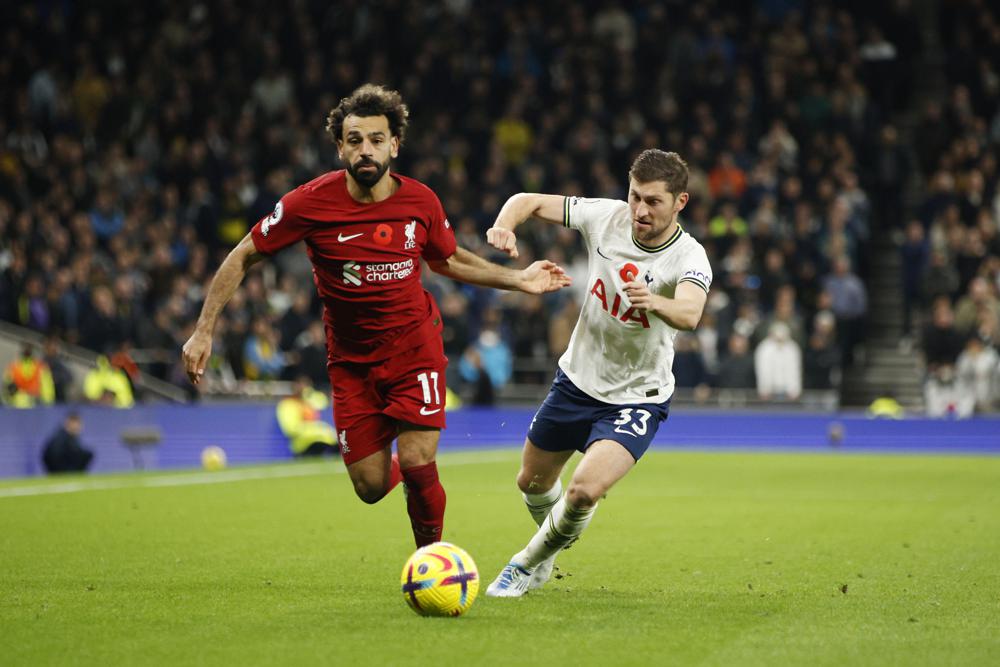 Liverpool's Mohamed Salah, left, challenges for the ball with Tottenham's Ben Davies during the English Premier League soccer match between Tottenham Hotspur and Liverpool at Tottenham Hotspur Stadium, in London. (AP)