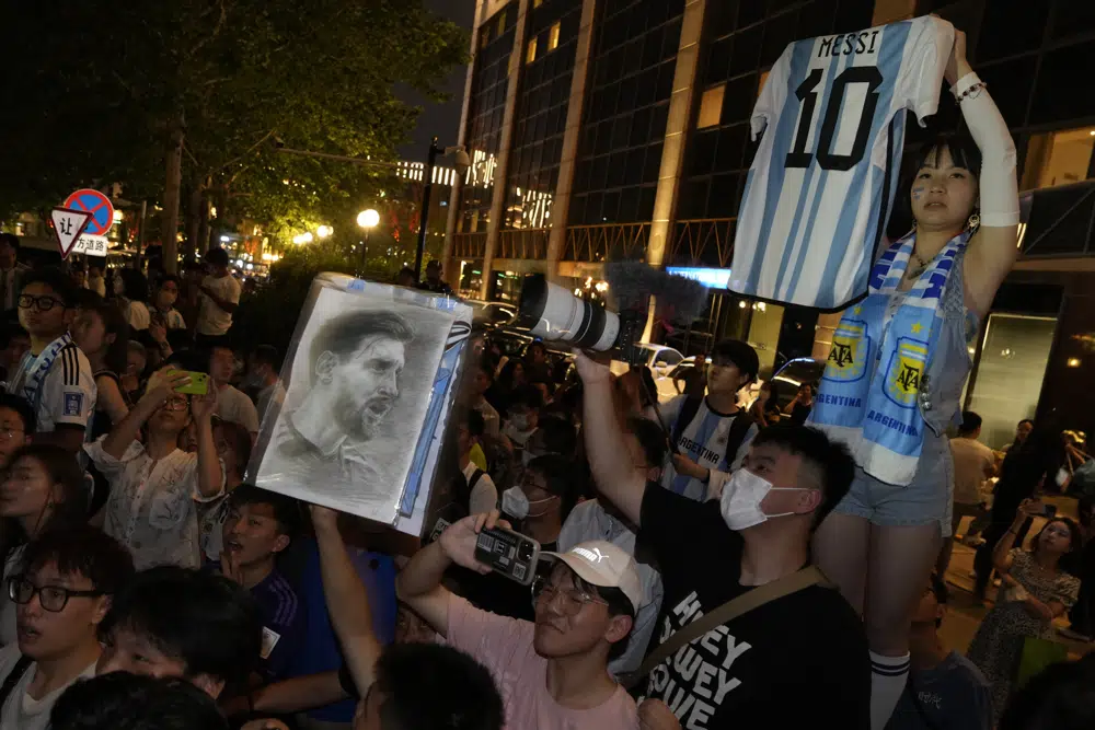 Chinese fans wait to catch a glimpse of the soccer superstar Lionel Messi in Beijing, Tuesday, June 13, 2023. (AP)