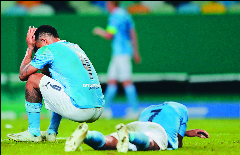 As Lyon players celebrate a famous win, Manchester City forwards Gabriel Jesus, left,and Raheem Sterling slump to the ground. AP, AFP