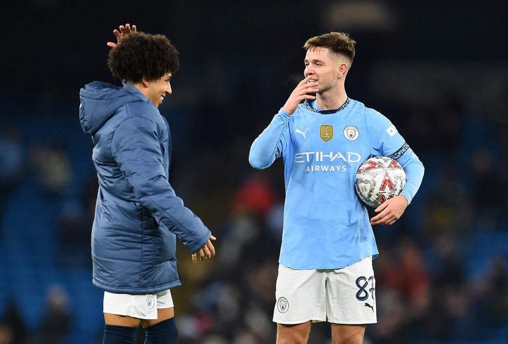 Manchester City's James McAtee (right) celebrates after the match with Rico Lewis. Photo/Reuters