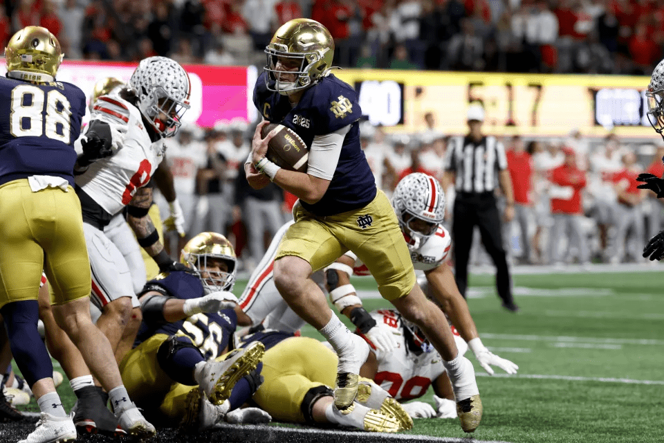 Notre Dame quarterback Riley Leonard runs for a touchdown against Ohio State during first half of the College Football Playoff national championship game Monday, Jan. 20, 2025, in Atlanta. (AP Photo/Butch Dill)ASSOCIATED PRESS