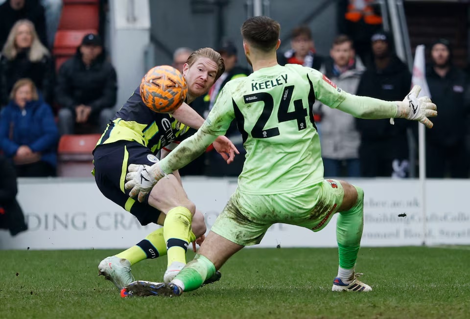 Jamie Donley's shot from just inside the City half which went in off the back of City keeper Stefan Ortega threatened a massive Cup shock, but the Premier League champions edged through as De Bruyne scored late on in a 2-1 victory.