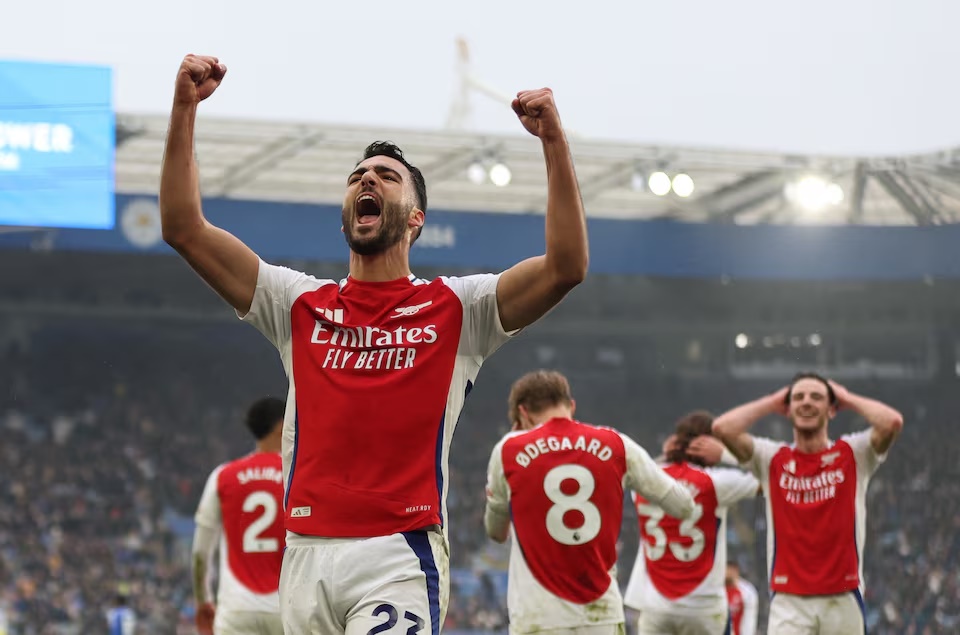 Midfielder Mikel Merino scored two late goals to keep Arsenal's Premier League title hopes alive with a 2-0 victory at Leicester City on Saturday, after the Spaniard was thrust into a makeshift centre-forward role by his club's injury crisis up front.