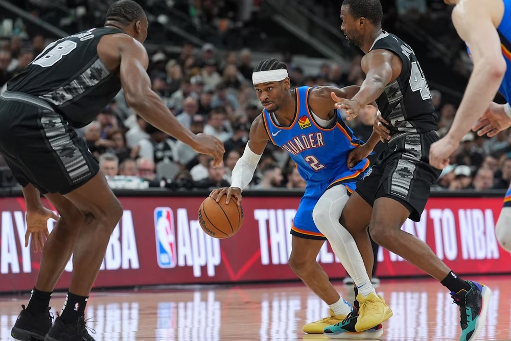 Oklahoma City Thunder guard Shai Gilgeous-Alexander (2) dribbles between San Antonio Spurs center Bismack Biyombo (18) and forward Harrison Barnes (40) in the second half at Frost Bank Center. (Reuters)