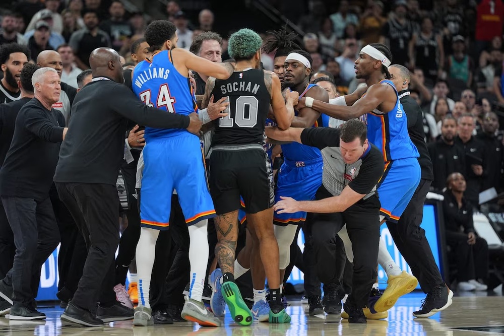A melee erupted with three minutes left in the third quarter and the Thunder ahead 100-96. The Spurs' Julian Champagnie and the Thunder's Kenrich Williams squared off after a shoving match near midcourt. Both players were ejected.