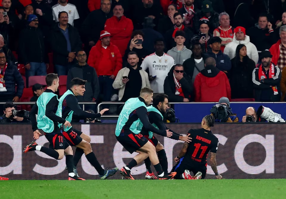 Raphinha struck a second-half winner to give Barcelona a lion-hearted 1-0 victory at Benfica on Wednesday as they overcame a red card for Pau Cubarsi early in the game to steal an advantage in the first leg of their Champions League last-16 tie.