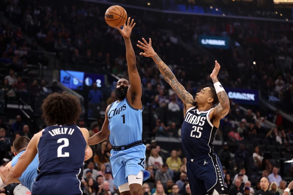 Los Angeles Clippers guard James Harden (1) shoots the ball against Dallas Mavericks forward P.J. Washington (25) during the first quarter at Intuit Dome. (Reuters)