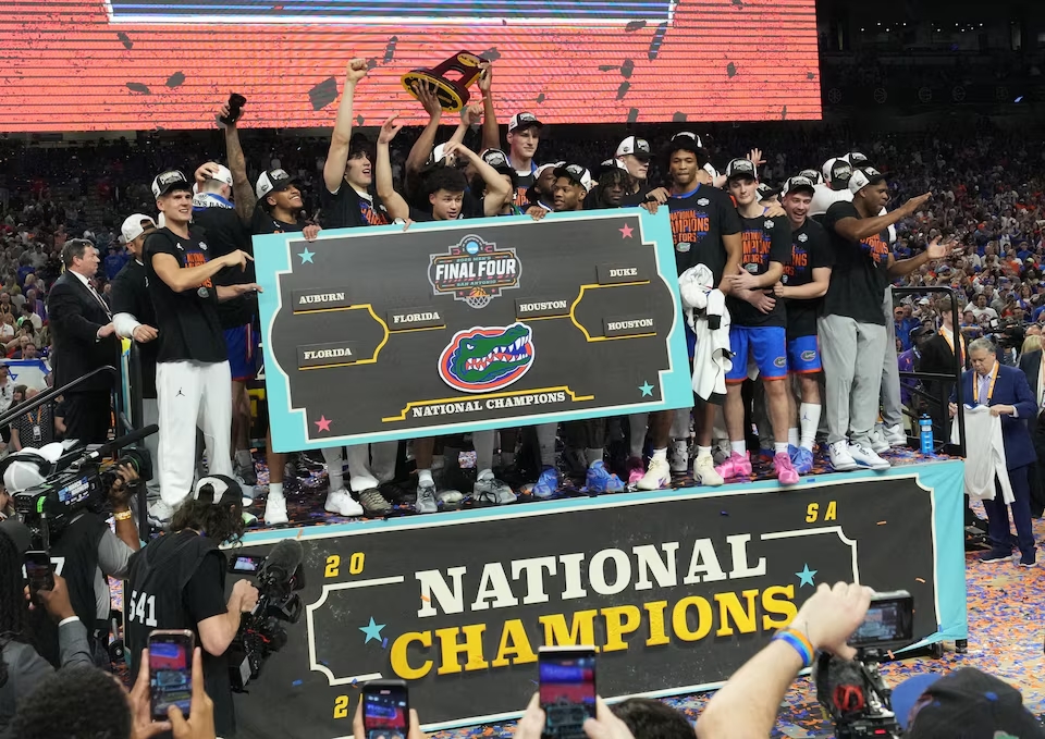 Florida Gators players celebrate with the trophy after defeating the Houston Cougars in the national championship game of the Final Four of the 2025 NCAA Tournament at the Alamodome. (Reuters)