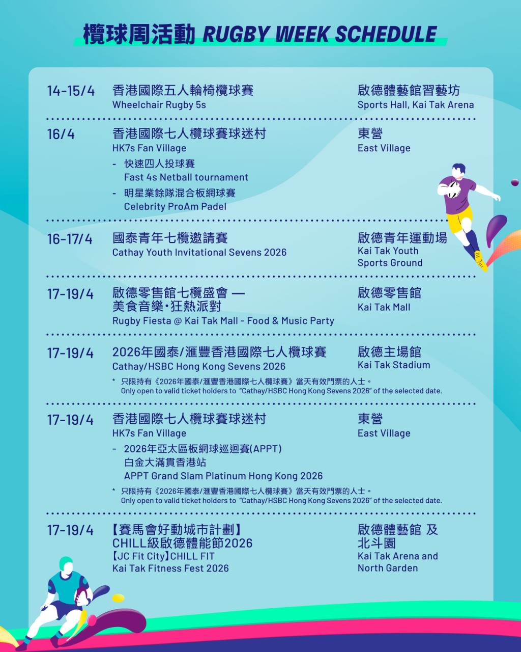 - The Cathay Youth 7s Invitational will run on April 16 and 17 at the Kai Tak Youth Sports Ground, alongside the newly introduced high-intensity “Primal Race” fitness competition from April 17 to 19.