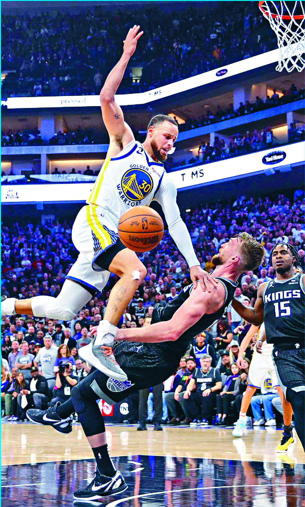 Stephen Curry, who led the Warriors with 28 points, braces for a landing after being fouled by Domantas Sabonis at Sacramento's Golden 1 Center. AFP
