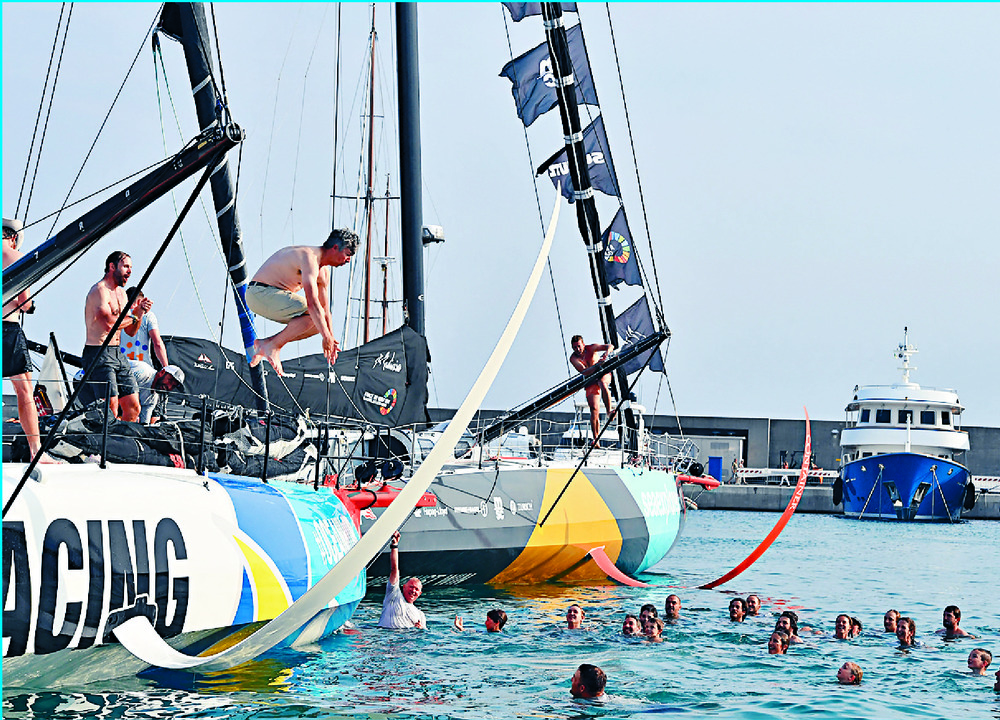 11th Hour eases into port in Genoa for a celebration at the end of the 27,000-mile Ocean Race, with skipper Charlie Enright and co-founder Wendy Schmidt raising the trophy and crew members diving into the water. REUTERS