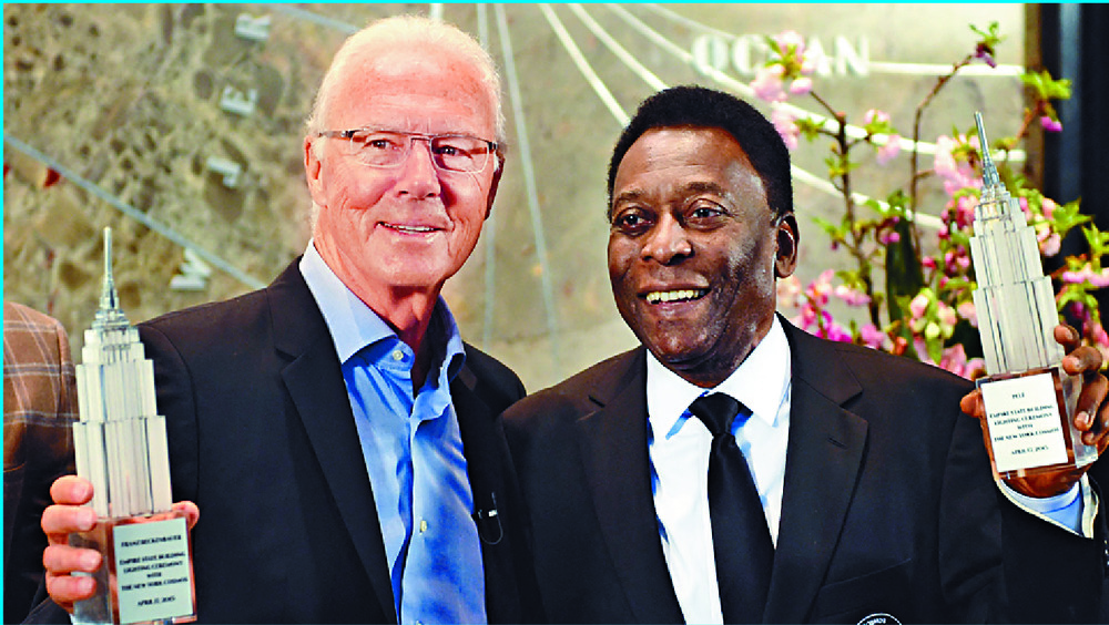 Clockwise from left: Franz Beckenbauer lifts the World Cup trophy as West Germany captain in 1974; 'Kaiser' just before a Bayern Munich match kicks off in 2017; in New York with fellow football great Pele in 2015; and Beckenbauer in action against Pe
