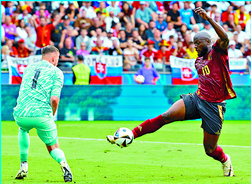 Belgium's Romelu Lukaku fires against Slovakia's Martin Dubravka. XINHUA