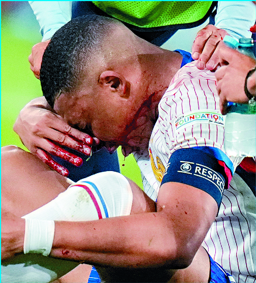 Blood flows from the nose of Kylian Mbappe after his head hit the shoulder of Austria defender Kevin Danso during an aerial duel late in the Group D match. AP, AFP