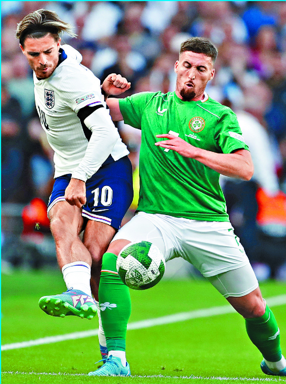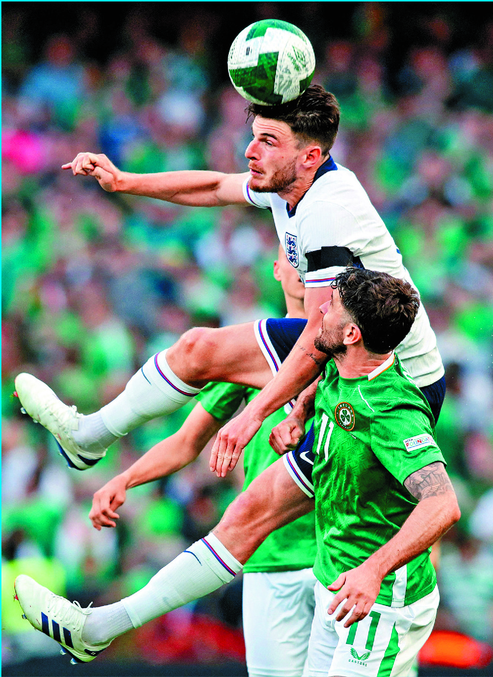 Declan Rice jumps for the ball while Jack Grealish is challenged by Matt Doherty. AFP, AP