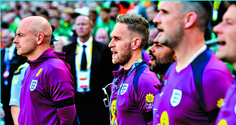 Lee Carsley, left, listens to the national anthem prior to kick-off against Ireland in Dublin. REUTERS