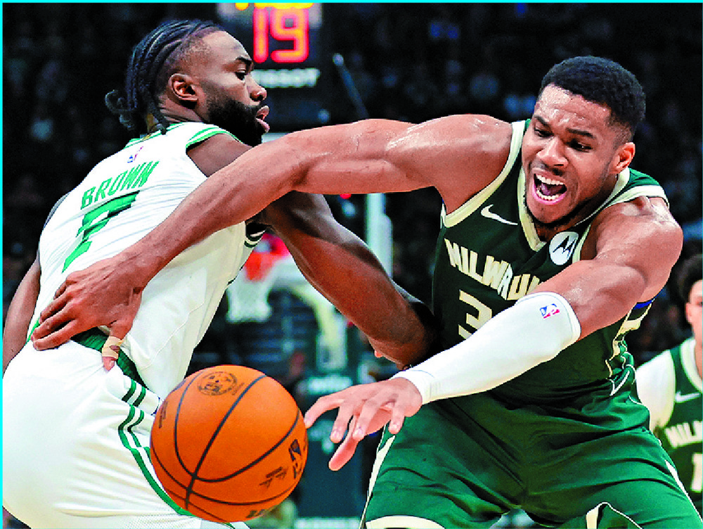Giannis Antetokounmpo tries to get around Jaylen Brown, left. AFP