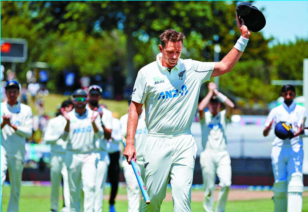 Tim Southee gestures to the crowd as he leaves the field following his final Test for New Zealand, a 423-run victory over England at Seddon Park in Hamilton. AFP