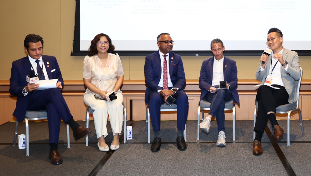 (From left) Rizwan Ullah, appointed district councilor for Kowloon City District; Theresa Cunanan, senior lecturer at the Hong Kong Baptist University; Sudesh Thevasenabathy, head of diversity, equity and inclusion at Manulife Asia; Bruce Liew, director of capability implementation and people strategy at Singapore’s National Council of Social Service; and Kai-chung Lo, vice-chairman of the network on ethnic minorities service at HKCSS.