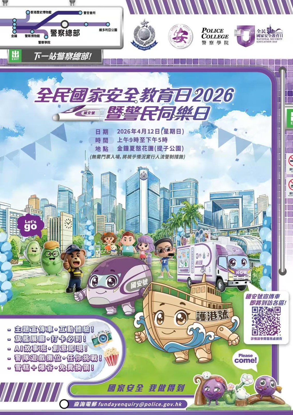 The police will also host a national security education event with the theme "Sailing for a Protected Hong Kong" at Harcourt Garden on April 12, which will also feature the "NSpeed" vehicle.