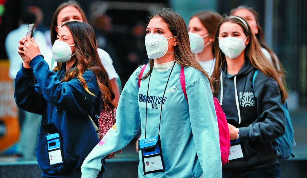 It's not because of Covid-19 that this group of New York students is wearing face masks but pollution from Canadian wildfires that enveloped the Big Apple in an orange haze last year. AFP