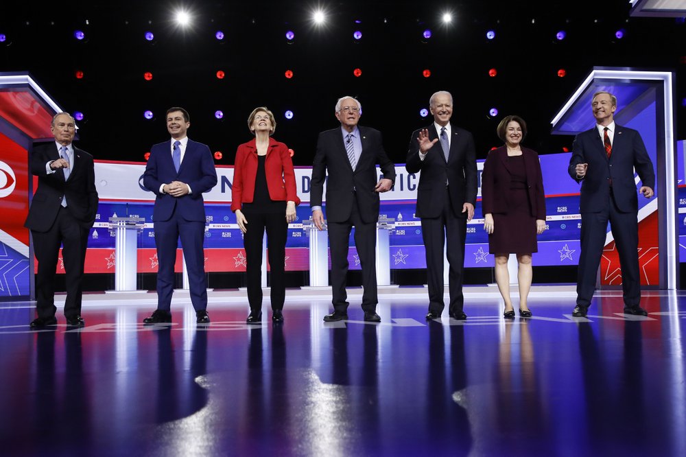 Photo: From left, Democratic presidential candidates, former New York City Mayor Mike Bloomberg, former South Bend Mayor Pete Buttigieg, Senator Elizabeth Warren, Senator Bernie Sanders, former vice president Joe Biden, Senator Amy Klobuchar, and businessman Tom Steyer stand on stage before a Democratic presidential primary debate, Tuesday, in Charleston, South Carolina.