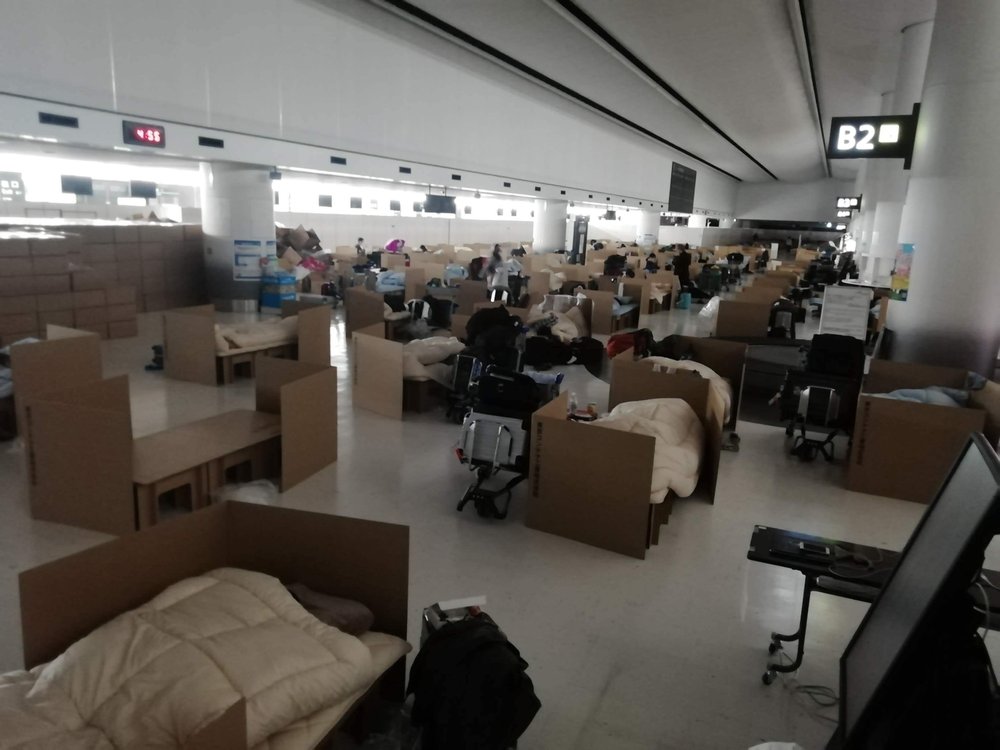 Photo provided by Naohiro Katsuta shows people waiting for their test results for the coronavirus at temporary beds made with cardboard boxes at Narita International Airport in Narita, near Tokyo. (via AP)