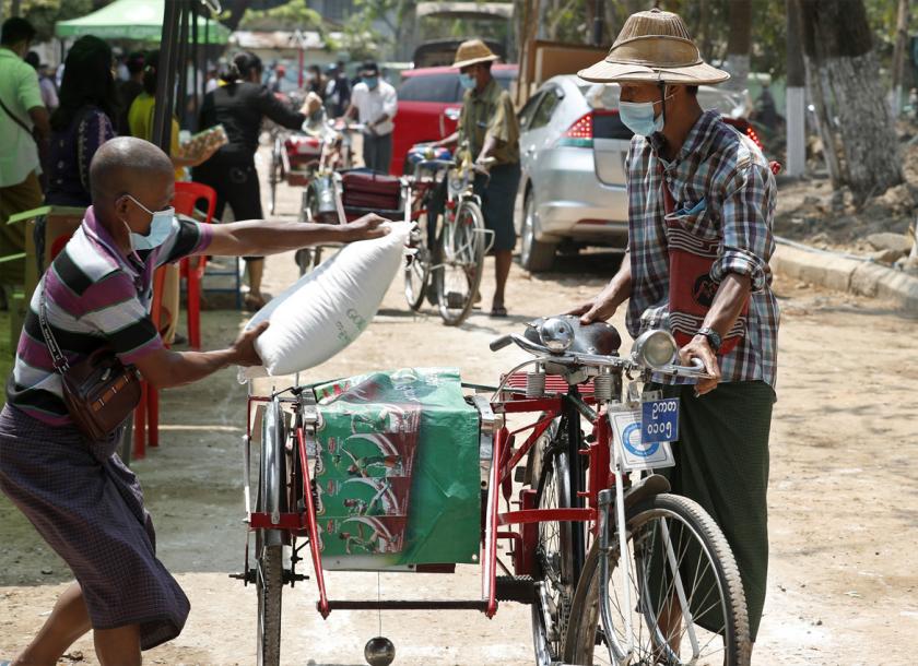 Trishaw drivers receive free food during a food donation to low income people in Yangon, on April 7.