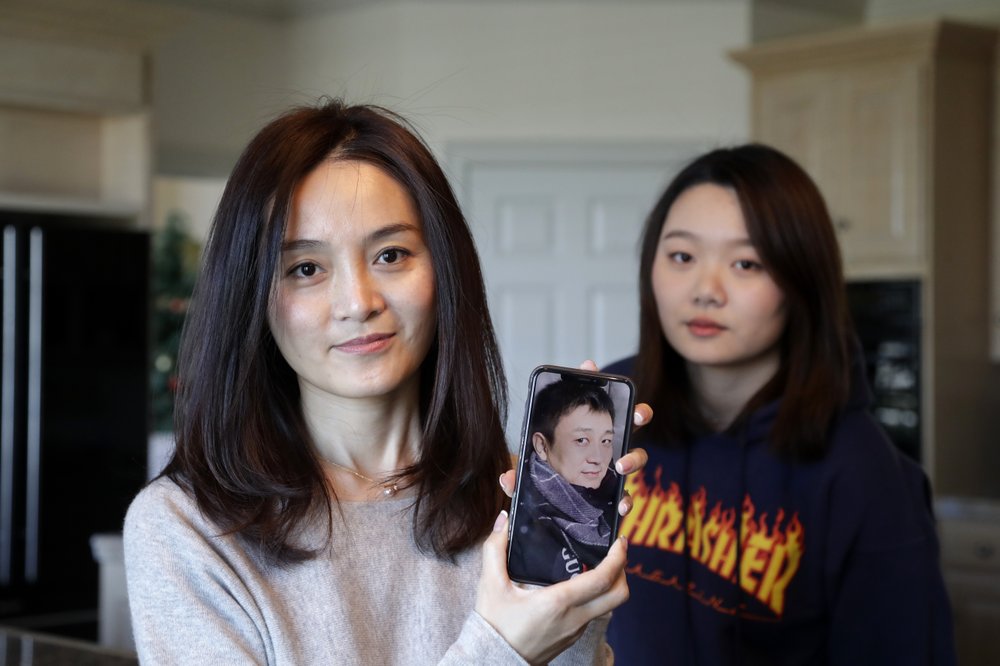 Jodie Chen, left, holds a photo of her husband, Daniel Hsu, as their daughter, Mandy Luo, looks on in their home in Issaquah, Washington, on Monday, April 13, 2020.