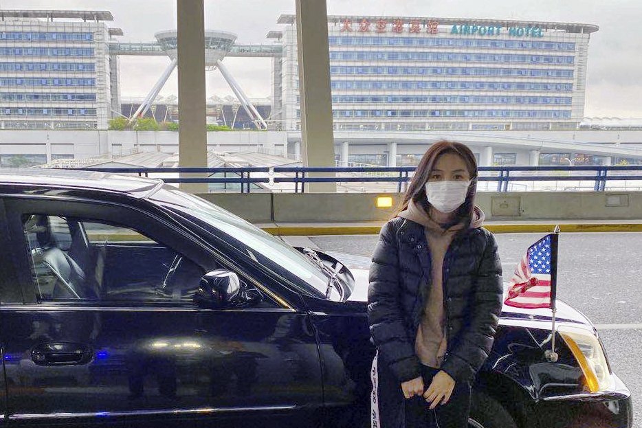 This photo provided by Daniel Hsu shows his wife, Jodie Chen, standing next to the car of the U.S. consul-general in Shanghai, before her flight home to her daughter in Seattle, after being blocked from leaving China for nearly three years.