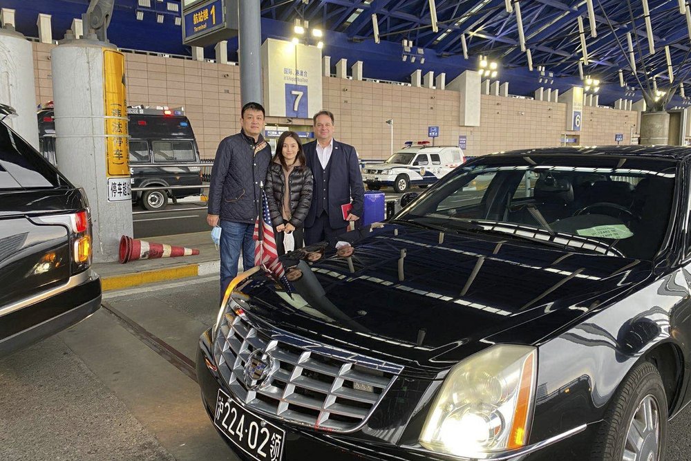 This photo provided by Daniel Hsu shows him, his wife, Jodie Chen, and the U.S. Consul General in Shanghai Sean Stein, before her flight home to her daughter in Seattle, after being blocked from leaving China for nearly three years.
