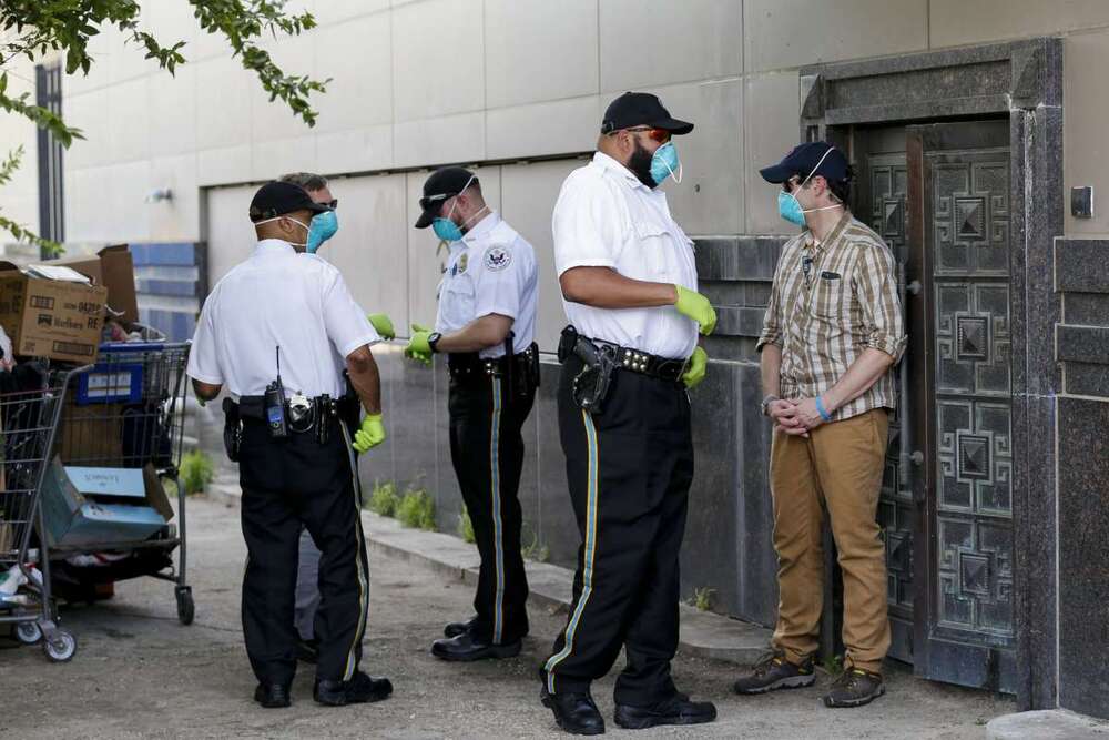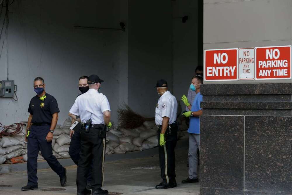 Members of the U.S. Department of State Diplomatic Security stand outside an alley entrance to the Consulate General of China building Friday, July 24, in Houston, in Texas.