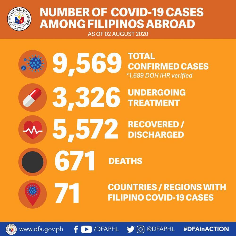 The number of Filipinos abroad sick with the coronavirus is now at 9,569, with 13 additional patients reported Sunday, the Department of Foreign Affairs said.
