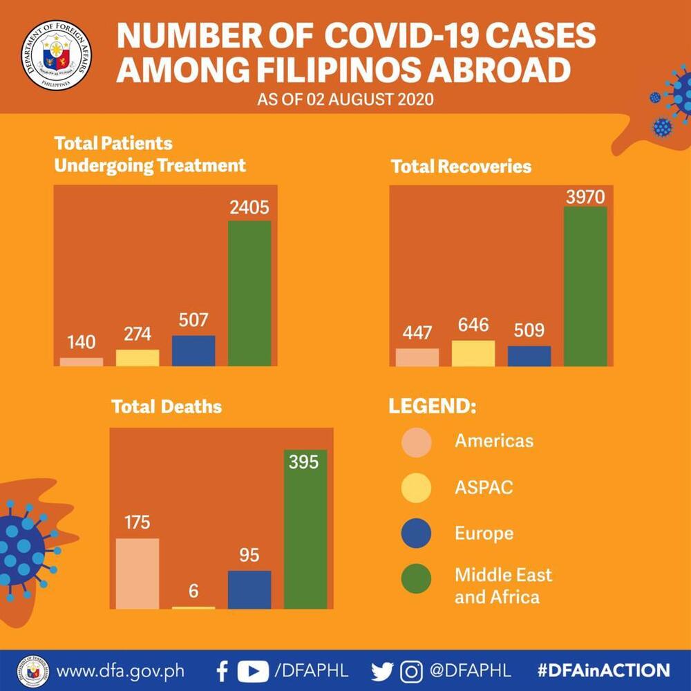 To date, some 3,326 Filipino patients abroad are undergoing treatment, broken down as follows by region: 274 in the Asia Pacific, 507 in Europe, 2,405 in the Middle East and Africa and 140 in the Americas.